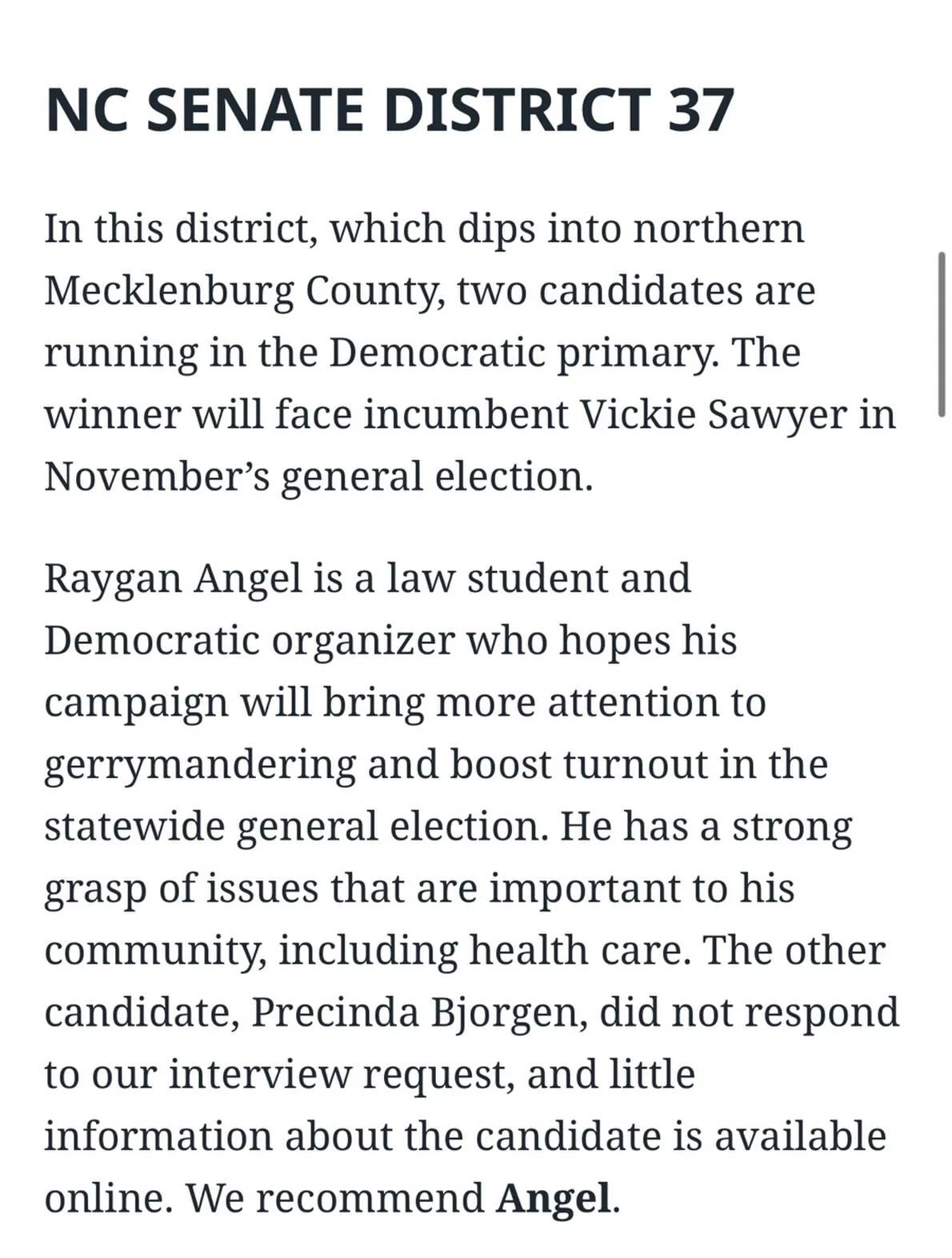 District 37 was drawn to protect politicians, not voters. Raygan is running to expand turnout, hold elected officials accountable, and strengthen the statewide races that can finally fix North Carolina’s broken maps.